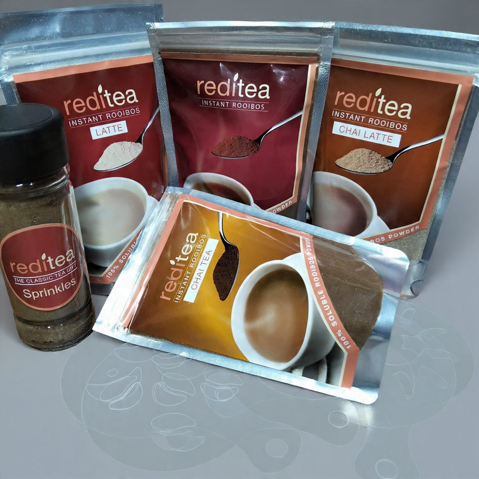 Rooibos fans will be blown away by this bundle! It packs reditea Instant Rooibos Latte, Chai Latte, Chai and reditea Instant Rooibos Tea, plus a bottle of Sprinkles for that extra flair. This bundle comes with 4 stencils (randomly added), making your tea experience a basket of choice!